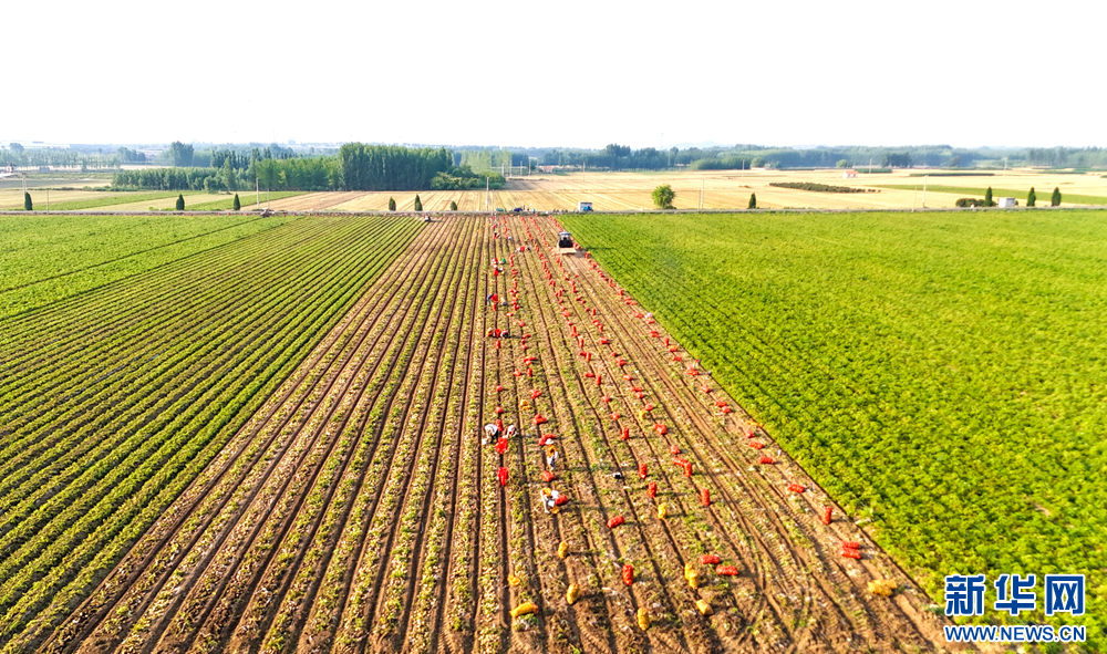 6月25日,在青岛西海岸新区六汪镇,种植户在田间收获马铃薯。新华网发(张进刚 摄)