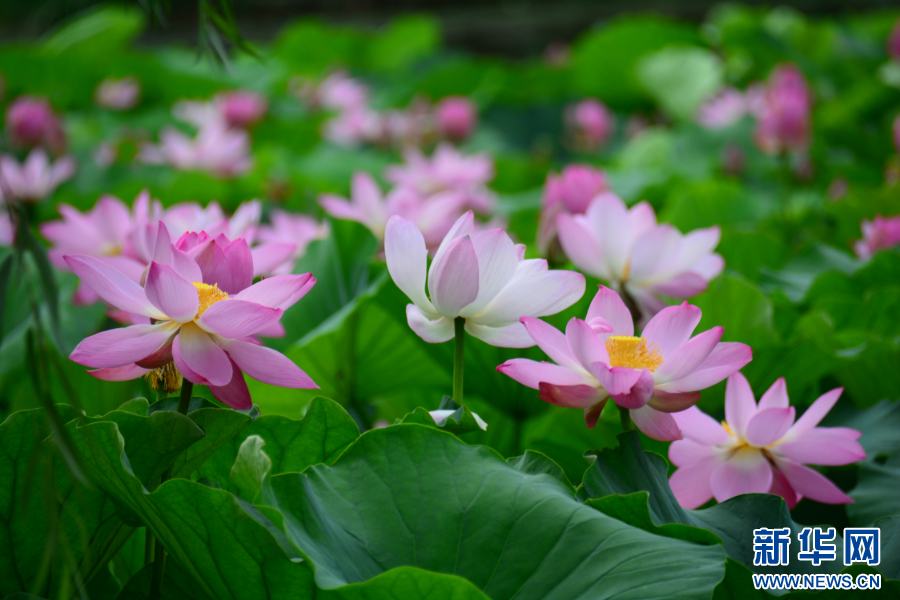 荷花次第绽放,市民拍照留念。新华网发(张乐民 摄)