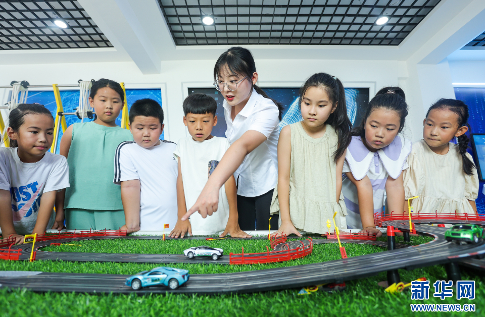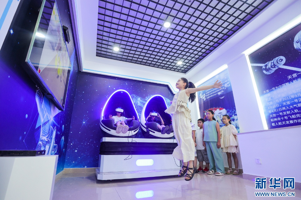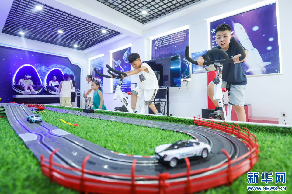 夏日炎炎,在山东省滨州市沾化区利国乡利国社区科普体验中心,孩子们一边纳凉,一边感受科学的魅力。新华网发(卞俊涵 摄)