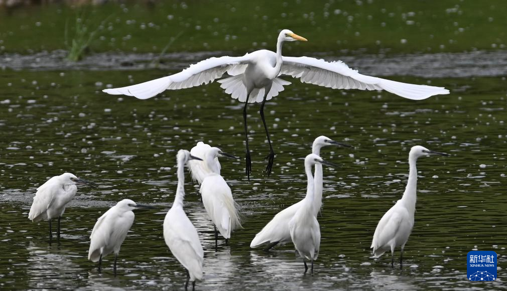 8月7日,白鹭在山东省高密市境内的胶河湿地觅食(无人机照片)。