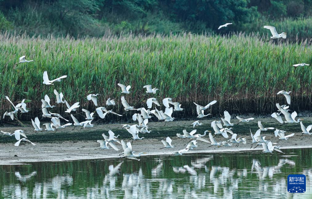 8月11日,在山东省荣成市桑沟湾湿地公园一处水域,成群的黄嘴白鹭、苍鹭等在休憩觅食。